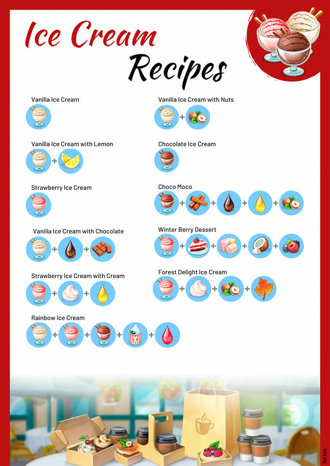 25 Mint Lemonade. 28 Cherry Punch. My Caf Winter Berry Dessert Recipe level 22 Strawberry Ice Cream.